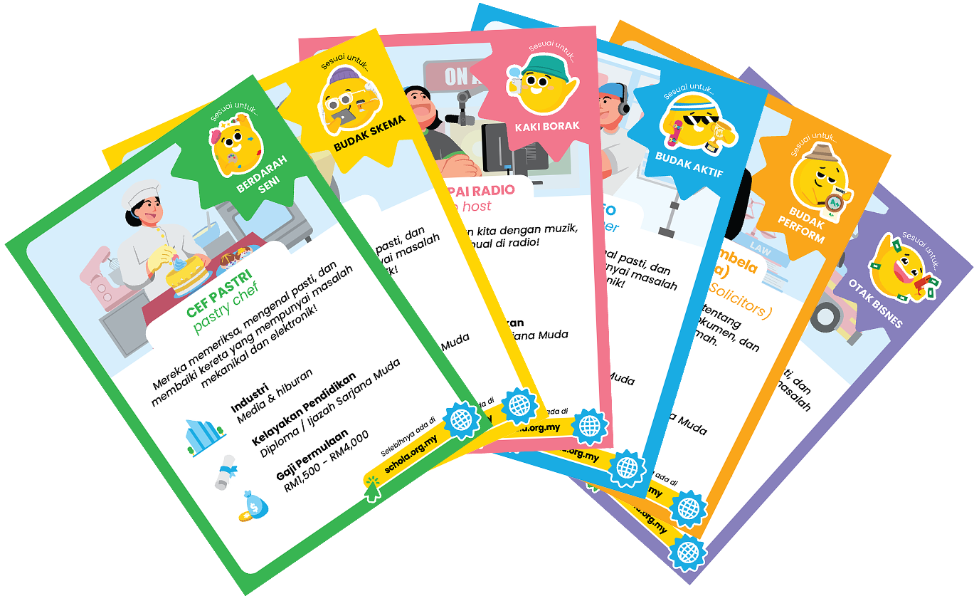 Each showcasing a different career — includes info on salary, education pathway, and industry, all linked to Schola’s fun career personalities.Perfect for interactive games and group activities that spark curiosity and career discovery.
